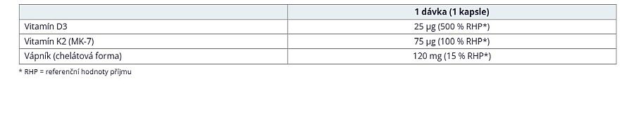 Složení: citrát vápenatý, želatinová kapsle, vitamín D3 (cholekalciferol), vitamín K2 MK-7 (menachinon), protispékavá látka: hořečnaté soli mastných kyselin