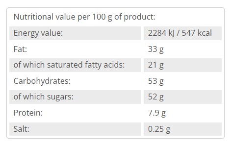 Content: Sugar, cocoa fat, whole milk powder, cocoa mass, skimmed milk powder, emulsifier: soy lecithin, vanilla extract. Cocoa mass min. 32%. Milk weight min. 20%.